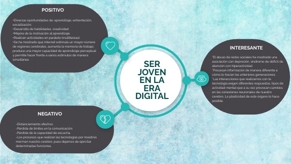 *El abuso de redes sociales ha mostrado una asociación con depresión, síndrome de déficit de atención con hiperactividad.*Procesan información de manera diferente a cómo lo hacían las anteriores generaciones. *Las interacciones que realizamos con la tecnología exigen diferentes respuestas, tipos de actividad mental que a su vez provocan cambios en las conexiones neuronales de nuestro cerebro. La plasticidad de este órgano lo hace posible.