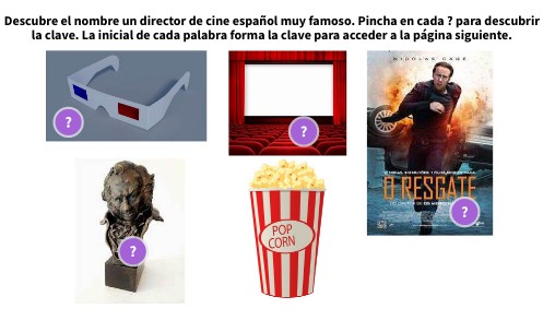 Descubre el nombre un director de cine español muy famoso. Pincha en cada ? para descubrir la clave. La inicial de cada palabra forma la clave para acceder a la página siguiente.