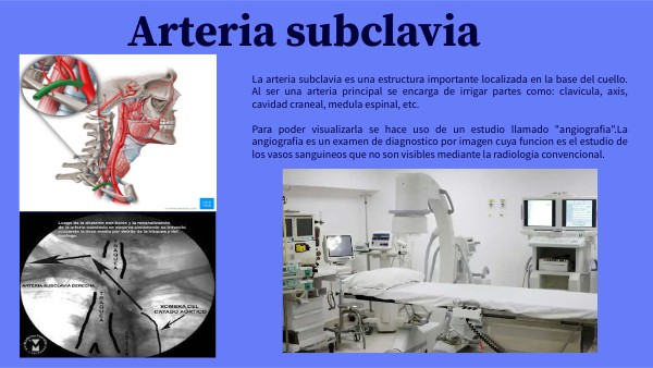 La arteria subclavia es una estructura importante localizada en la base del cuello. Al ser una arteria principal se encarga de irrigar partes como: clavicula, axis, cavidad craneal, medula espinal, etc. Para poder visualizarla se hace uso de un estudio llamado "angiografia".La angiografia es un examen de diagnostico por imagen cuya funcion es el estudio de los vasos sanguineos que no son visibles mediante la radiologia convencional.