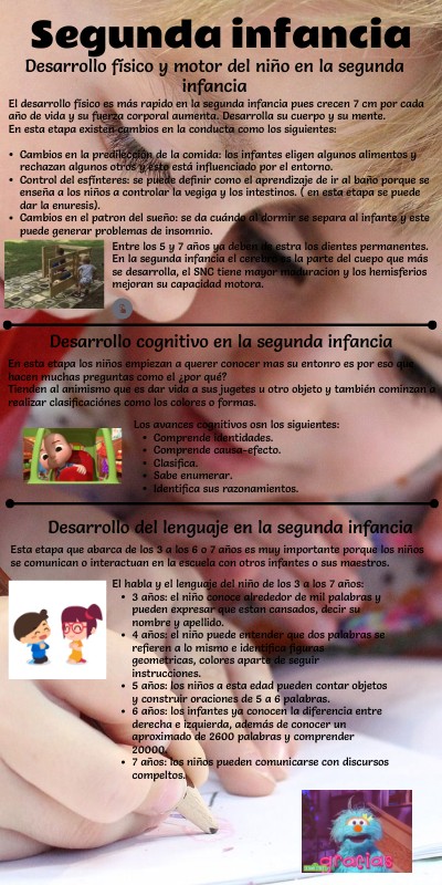 Entre los 5 y 7 años ya deben de estra los dientes permanentes.En la segunda infancia el cerebro es la parte del cuepo que más se desarrolla, el SNC tiene mayor maduracion y los hemisferios mejoran su capacidad motora.