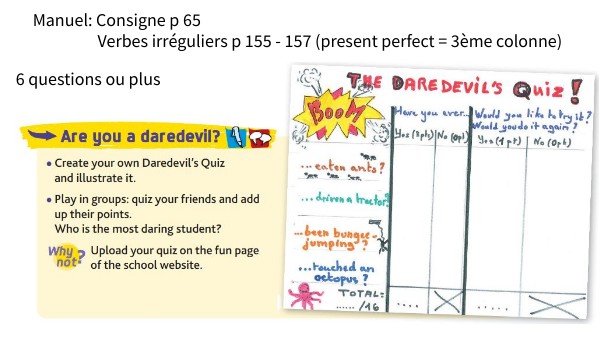 Manuel: Consigne p 65 Verbes irréguliers p 155 - 157 (present perfect = 3ème colonne)