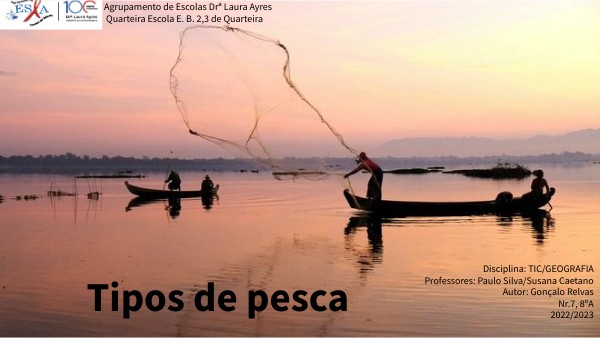 No âmbito das disciplinas de Geografia e TIC, foi-me solicitado um trabalho de pesquisa. O tópico escolhido por mim foi: tipos de pesca. Para além da pesquisa e da seleção de informação, tive de colocar em prática as minhas competências digitais, de modo a que a informação recolhida pudesse ser apresentada a partir deste Genilly. Espero conseguir ir ao encontro do esperado.
