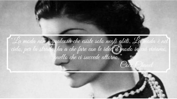 "La moda non è qualcosa che esiste solo negli abiti. La moda è nel cielo, per la strada, ha a che fare con le idee, il modo in cui viviamo, quello che ci succede attorno." Coco Chanel