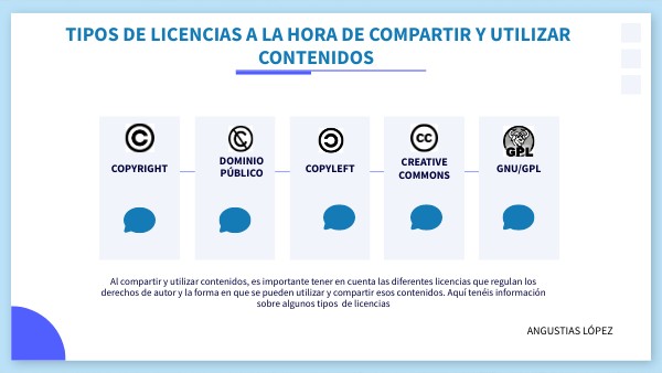 Al compartir y utilizar contenidos, es importante tener en cuenta las diferentes licencias que regulan los derechos de autor y la forma en que se pueden utilizar y compartir esos contenidos. Aquí tenéis información sobre algunos tipos de licencias