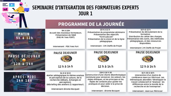 Présentation du programme:séminairePrésentation des objectifs "Form'Labcom" Présentation de la vision et de la ligne pédagogique. Intervenant : CM Cheffe de Projet