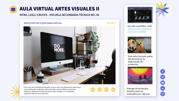 Con el uso de la plataforma Moodle, se busca dar una experiencia interactiva a los estudiantes mediante video tutoriales, pueda elaborar productos artísticos, utlizando las técnicas de las artes visuales y ser evaluados mediante rúbricas de evaluación.