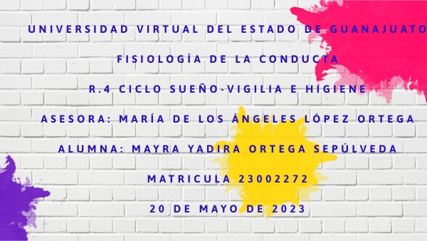 UNIVERSIDAD VIRTUAL DEL ESTADO DE GUANAJUATOFISIOLOGÍA DE LA CONDUCTA R.4 CICLO SUEÑO-VIGILIA E HIGIENE ASESORA: MARÍA DE LOS ÁNGELES LÓPEZ ORTEGA ALUMNA: MAYRA YADIRA ORTEGA SEPÚLVEDA MATRICULA 23002272 20 DE MAYO DE 2023