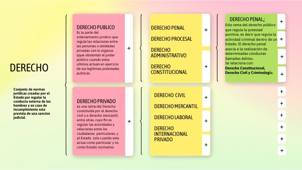 Esla rama del derecho público que regula la potestad punitiva, es decir que regula la actividad criminal dentro de un Estado. El derecho penal asocia a la realización de determinadas conductas llamadas delitos. Se relaciona con: Derecho Constitucional, Derecho Civil y Criminología.
