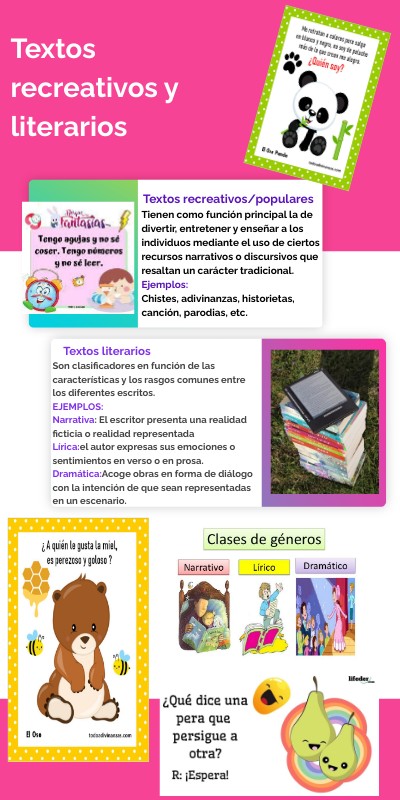 Tienen como función principal la de divertir, entretener y enseñar a los individuos mediante el uso de ciertos recursos narrativos o discursivos que resaltan un carácter tradicional. Ejemplos: Chistes, adivinanzas, historietas, canción, parodias, etc.
