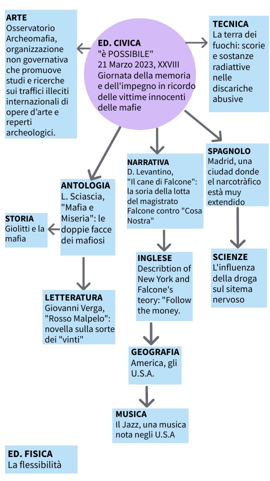 Ho iniziato da educazione civica parlando dello slogan dell'associazione Libera cioè: "È POSSIBILE", perchè il 21 Marzo è la Giornata della Memoria in ricordo delle vittime innocenti delle Mafie. Succesivamente mi sono collegata ad Arte, parlando dell' Osservatorio Archeomafia, cioè un luogo dove si possono vedere le opere d' arte, reperti archeologici e le ricerche sui traffici internazionali di esse. Dopodichè sempre partendo dall'argomento principale ho collegato Antologia, perchè a scuola abbiamo letto un brano di L. Sciascia, intitolato: "Mafia e Miseria", ambientato in Sicilia, che parla di come i capi mafia possano avere "2 facce". Ad Antologia ho collegato Storia, parlando dell'età Giolittiana perchè anche Giolitti veniva considerato un uomo a doppia faccia. Sempre ad Antologia ho anche collegato Letteratura, con lo scrittore: Giovanni Verga, il Verismo e il brano:"Rosso Malpelo", perchè il suo Paese natale è la Sicilia. A Educazione Civica collego anche Narrativa, perchè a scuola abbiamo letto un libro di D. Levantino, intitolato: "Il cane di Falcone", che parla di come Falcone ed altri personaggi siano riusciti a sconfiggere la Mafia. A Narrativa ho collegato Inglese, con New York e in particolare il concetto di Giovanni Falcone: Follow the money. A Inglese, Geografia con l'America e gli U.S.A. perchè New York si trova lì