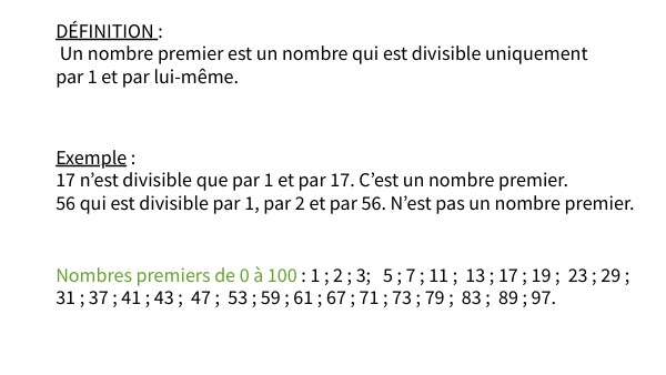 DÉFINITION : Un nombre premier est un nombre qui est divisible uniquement par 1 et par lui-même.