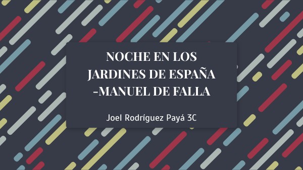 La pieza se llama noches en los jardines de España,Falla la comenzó como un conjunto de nocturnos para piano en 1909 pero el pianista Ricardo Viñes le sugirió que lo transformara en una obra para piano y orquesta,una vez terminada en 1915,Falla se la dedicó a él.