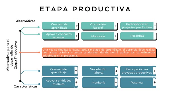 Una vez se finaliza la etapa lectiva o etapa de aprendizaje, el aprendiz debe realizar una etapa práctiva o etapa productiva, donde podrá aplicar los conocimientos adquiridos en el programa.