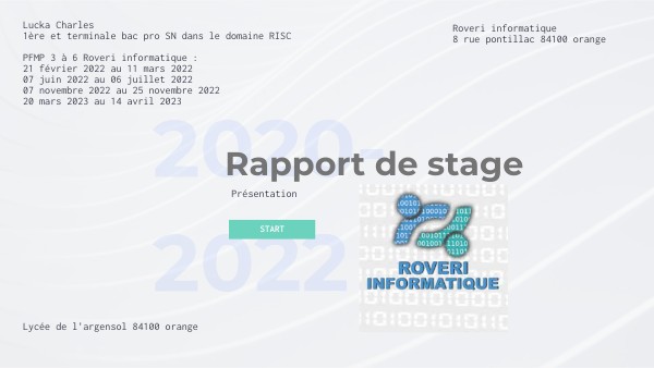 Lucka Charles 1ère et terminale bac pro SN dans le domaine RISC PFMP 3 à 6 Roveri informatique : 21 février 2022 au 11 mars 2022 07 juin 2022 au 06 juillet 2022 07 novembre 2022 au 25 novembre 2022 20 mars 2023 au 14 avril 2023