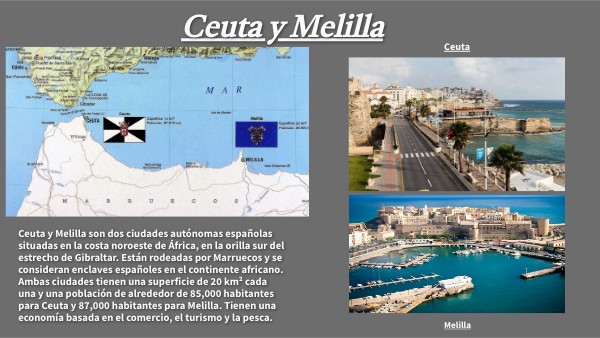Ceuta y Melilla son dos ciudades autónomas españolas situadas en la costa noroeste de África, en la orilla sur del estrecho de Gibraltar. Están rodeadas por Marruecos y se consideran enclaves españoles en el continente africano. Ambas ciudades tienen una superficie de 20 km² cada una y una población de alrededor de 85,000 habitantes para Ceuta y 87,000 habitantes para Melilla. Tienen una economía basada en el comercio, el turismo y la pesca.
