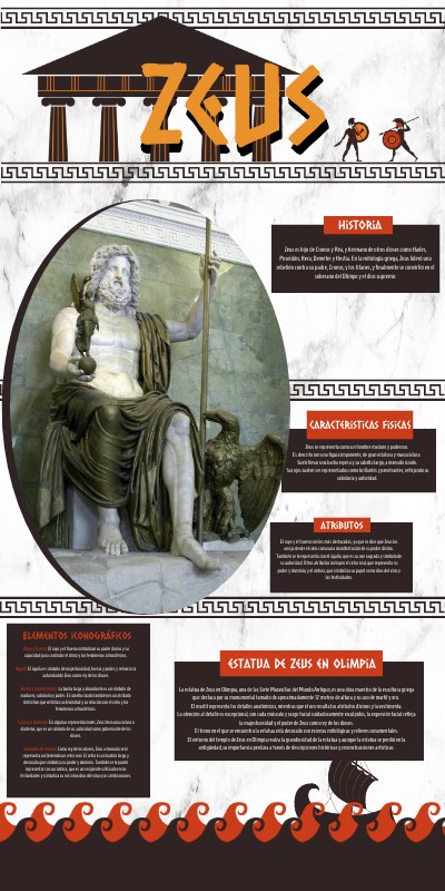 Rayo y trueno: El rayo y el trueno simbolizan su poder divino y su capacidad para controlar el clima y los fenómenos atmosféricos. Águila: El águila es símbolo de majestuosidad, fuerza y poder, y refuerza la autoridad de Zeus como rey de los dioses. Barba y cabello rizado: La barba larga y abundante es un símbolo de madurez, sabiduría y poder. El cabello rizado también es un atributo distintivo que enfatiza su divinidad y su relación con el cielo y los fenómenos atmosféricos. Corona o diadema: En algunas representaciones, Zeus lleva una corona o diadema, que es un símbolo de su autoridad como gobernante de los dioses. Símbolos de realeza: Como rey de los dioses, Zeus a menudo se le representa sosteniendo un cetro real. El cetro es un bastón largo y decorado que simboliza su poder y dominio. También se le puede representar con un ánfora, que es un recipiente utilizado en las festividades y simboliza su rol como dios del vino y las celebraciones.
