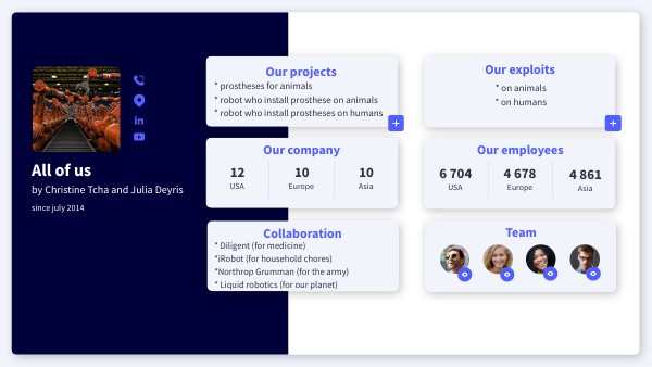 * Diligent (for medicine)*iRobot (for household chores) *Northrop Grumman (for the army) * Liquid robotics (for our planet)