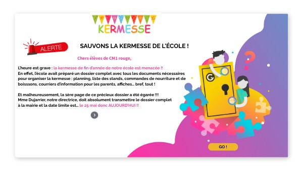 Pour sauver la kermesse, vous allez devoir résoudre 4 missions en binôme. Chaque binôme qui validera les missions gagnera 1 morceau de la page égarée. A la fin, lorsque tous les binômes auront remporté leur morceau de page, nous pourrons la reconstituer et la donner à temps à Mme Dujarrier ! Et ainsi nous sauverons la kermesse ! Bonne chance !