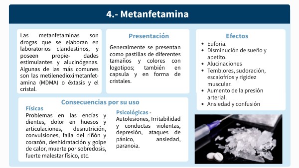 Las metanfetaminas son drogas que se elaboran en laboratorios clandestinos, y poseen propie- dades estimulantes y alucinógenas. Algunas de las más comunes son las metilenedioximetanfet- amina (MDMA) o éxtasis y el cristal.