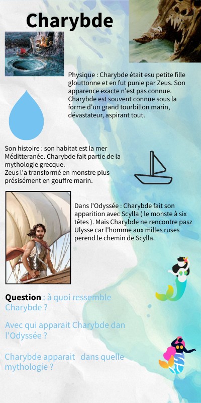 Son histoire : son habitat est la mer Méditteranée. Charybde fait partie de la mythologie grecque. Zeus l'a transformé en monstre plus présisément en gouffre marin.