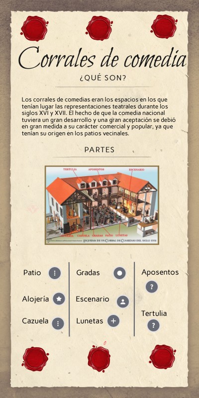 Los corrales de comedias eran los espacios en los que tenían lugar las representaciones teatrales durante los siglos XVI y XVII. El hecho de que la comedia nacional tuviera un gran desarrollo y una gran aceptación se debió en gran medida a su carácter comercial y popular, ya que tenían su origen en los patios vecinales.