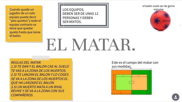 REGLAS DEL MATAR. 1.SI TE DAN Y EL BALON CAE AL SUELO TE VAS A LA ZONA DE LOS MUERTOS. 2.SI TE LANZAN EL BALON Y LO COGES SE VA A LA ZONA DE LOS MUERTOS EL QUE HA LANZADO EL BALON. 3.SI UN MUERTO MATA A UN RIVAL REVIVE Y SE VA A LA ZONA CON SUS COMPAÑEROS.