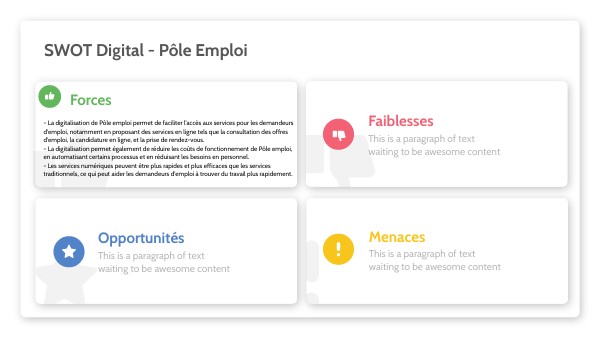 - La digitalisation de Pôle emploi permet de faciliter l'accès aux services pour les demandeurs d'emploi, notamment en proposant des services en ligne tels que la consultation des offres d'emploi, la candidature en ligne, et la prise de rendez-vous. - La digitalisation permet également de réduire les coûts de fonctionnement de Pôle emploi, en automatisant certains processus et en réduisant les besoins en personnel. - Les services numériques peuvent être plus rapides et plus efficaces que les services traditionnels, ce qui peut aider les demandeurs d'emploi à trouver du travail plus rapidement.