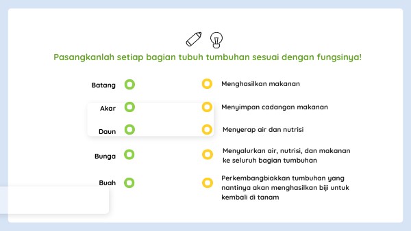 Pasangkanlah setiap bagian tubuh tumbuhan sesuai dengan fungsinya!