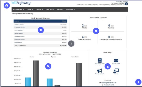 Prepaid Card: Re-loadable Mastercard to use for both in person or online purchasesOnline Bill Pay: Recurring or one time payments via ACH, EFT, or check to vendors or HQ. Send Money: Send funds directly to other groups using Billhighway.
