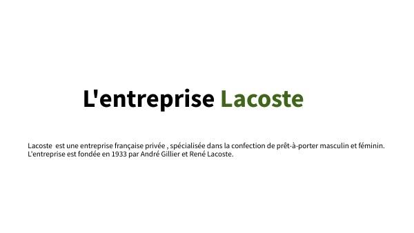 Lacoste est une entreprise française privée , spécialisée dans la confection de prêt-à-porter masculine et féminine. L'entreprise est fondée en 1933 par André Gillier et René Lacoste.