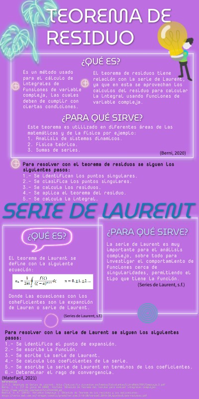 Referencias (s.f.). Obtenido de Series de Laurent: http://pelusa.fis.cinvestav.mx/tmatos/Estudiantes/LibroMath/PDF/Compleja_3.pdf Berni, 1. c. (17 de junio de 2020). YouTube. Obtenido de Teorema del residuo para evaluar integrales complejas: https://www.youtube.com/watch?v=sZhhhY69_qQ Madrid, U. A. (2019). Variable Compleja I. Obtenido de Teorema de los residuos y sus aplicaciones: https://verso.mat.uam.es/~dragan.vukotic/grado/var_com_I-19-20/varcomI_2019-20_apuntes8_tma-residuos.pdf