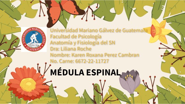 Universidad Mariano Gálvez de Guatemala Facultad de Psicología Anatomía y Fisiología del SN Dra: Liliana Roche Nombre: Karen Roxana Perez Cambran No. Carne: 6672-22-11727