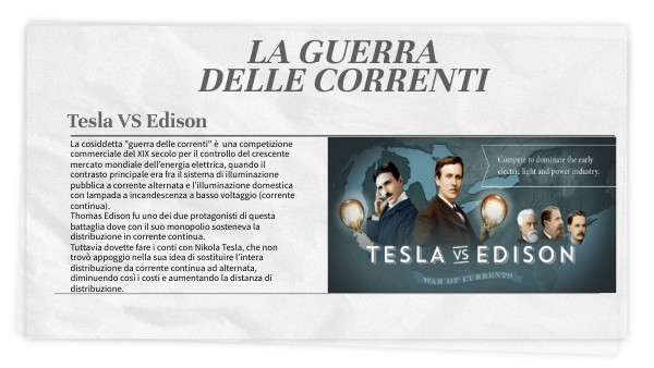 La cosiddetta "guerra delle correnti" è una competizione commerciale del XIX secolo per il controllo del crescente mercato mondiale dell’energia elettrica, quando il contrasto principale era fra il sistema di illuminazione pubblica a corrente alternata e l’illuminazione domestica con lampada a incandescenza a basso voltaggio (corrente continua). Thomas Edison fu uno dei due protagonisti di questa battaglia dove con il suo monopolio sosteneva la distribuzione in corrente continua. Tuttavia dovette fare i conti con Nikola Tesla, che non trovò appoggio nella sua idea di sostituire l’intera distribuzione da corrente continua ad alternata, diminuendo così i costi e aumentando la distanza di distribuzione.