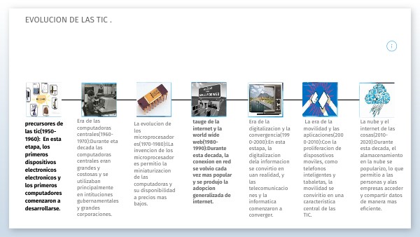 La era de la movilidad y las aplicaciones(2000-2010):Con la proliferacion de disposotivos moviles, como telefonos inteligentes y tabaletas, la movilidad se conviritio en una caracteristica central de las TIC.