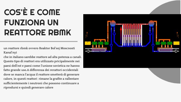 un reattore rbmk ovvero Reaktor Bol'soj Moscnosti Kanal'nyi che in italiano sarebbe reattore ad alta potenza a canali. Questo tipo di reattori era utilizzato pricipalmente nei paesi dell'est e paesi come l'unione sovietica ne hanno fatto grande uso.A differenza dei rerattori occidentali dove se manca l'acqua il reattore smetterà di generare calore, in questi reattori rimane la grafite a rallentare sufficientemente i neutroni che possono continuare a riprodursi e quindi generare calore