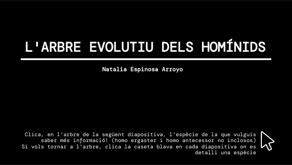 Clica, en l'arbre de la següent diapositiva, l'espècie de la que vulguis saber més informació! (homo ergaster i homo antecessor no inclosos) Si vols tornar a l'arbre, clica la caseta blava en cada diapositiva on es detalli una espècie