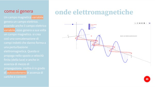 Un campo magnetico variabile genera un campo elettrico. essendo anche il campo elettrico variabile, esso genera a sua volta un campo magnetico. si crea così una concatenazione di campi indotti che danno forma a una perturbazione elettromagnetica. Questa si propaga nello spazio a velocità finita (della luce) e anche in assenza di mezzo di propagazione. inoltre è in grado di autosostenersi in assenza di cariche e correnti