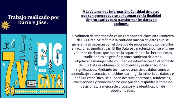 V 1: Volumen de Información. Cantidad de datos que son generados y se almacenan con la finalidad de procesarlos para transformar los datos en acciones.