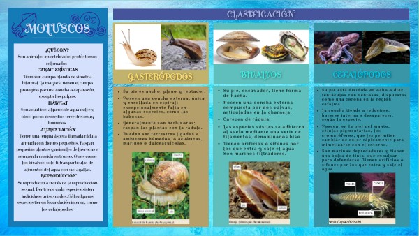 ¿QUÉ SON? Son animales invertebrados protóstomos celomados CARACTERÍSTICASTienen un cuerpo blando de simetría bilateral. La mayoría tienen el cuerpo protegido por una concha o caparazón, excepto los pulpos. HÁBITATSon acuáticos algunos de agua dulce y otros pocos de medios terrestres muy húmedos. ALIMENTACIÓN Tienen una lengua áspera llamada rádula armada con dientes pequeños. Raspan pequeñas plantas y animales de las rocas o rompen la comida en trozos. Otros como los bivalvos solo filtran partículas de alimentos del agua con sus agallas. REPRODUCCIÓN Se reproducen a través de la reproducción sexual. Dentro de cada especie existen individuos unisexuados. Sólo algunas especies tienen fecundación interna, como los cefalópodos.