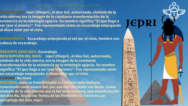 ADVOCACIÓN: Jepri (Khepri), el dios Sol, autocreado, símbolo de la vida eterno; era la imagen de la constante transformación de la existencia en la mitología egipcia. Su nombre significa "El que llega a ser (por sí mismo)". Fue representado como un escarabajo empujando al disco solar por el cielo. ICONOGRAFÍA: Escarabajo empujando el sol por el cielo, hombre con cabeza de escarabajo. SER/ENTE ASOCIADO: Escarabajo DESCRIPCIÓN DEL DIOS: Jepri (Khepri), el dios Sol, autocreado, símbolo de la vida eterno; era la imagen de la constante transformación de la existencia en la mitología egipcia. Su nombre significa "El que llega a ser (por sí mismo)". Fue representado como un escarabajo empujando al disco solar por el cielo. CORONA: No tiene HISTORIA: Jepri se transformaba a sí mismo cada mañana, renaciendo como nuevo Sol, por eso fue vinculado con Atum. Como símbolo de la vida eterna, era el Sol de la mañana, una manifestación del dios Ra. Según los Textos de las Pirámides la Tierra era un escupitajo del dios Jepri.