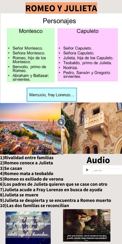 1)Rivalidad entre familias 2)Romeo conoce a Julieta 3)Se casan 4)Romeo mata a teobaldo 5)Romeo es exiliado de verona 6)Los padres de Julieta quieren que se case con otro 7)Julieta acude a Fray Lorenzo en busca de ayuda 8)Julieta se muere 9)Julieta se despierta y se encuentra a Romeo muerto 10)Las dos familias se reconcilian