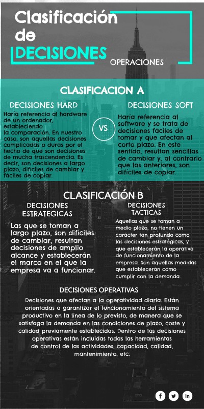 Decisiones que afectan a la operatividad diaria. Están orientadas a garantizar el funcionamiento del sistema productivo en la línea de lo previsto, de manera que se satisfaga la demanda en las condiciones de plazo, coste y calidad previamente establecidas. Dentro de las decisiones operativas están incluidas todas las herramientas de control de las actividades, capacidad, calidad, mantenimiento, etc.