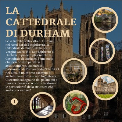 Se vi trovate nella città di Durham, nel Nord Est dell'Inghilterra, la Cattedrale di Cristo, della Beata Vergine Maria e di San Cutberto di Durham ,o più semplicemente la Cattedrale di Durham, è una meta che non dovete perdervi assolutamente. Dichiarata patrimonio dell'umanità dall'UNESCO nel 1986, è un ottimo esempio di architettura romanica in Inghilterra. Cliccando su ognuno dei pallini qui a fianco è possibile scoprire la storia e le particolarità della struttura che andrete a visitare!