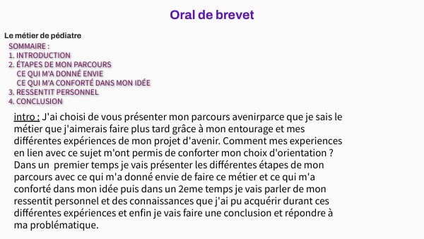 intro : J'ai choisi de vous présenter mon parcours avenirparce que je sais le métier que j'aimerais faire plus tard grâce à mon entourage et mes différentes expériences de mon projet d'avenir. Comment mes experiences en lien avec ce sujet m'ont permis de conforter mon choix d'orientation ? Dans un premier temps je vais présenter les différentes étapes de mon parcours avec ce qui m'a donné envie de faire ce métier et ce qui m'a conforté dans mon idée puis dans un 2eme temps je vais parler de mon ressentit personnel et des connaissances que j'ai pu acquérir durant ces différentes expériences et enfin je vais faire une conclusion et répondre à ma problématique.