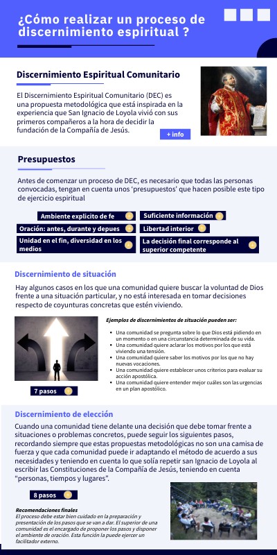 El Discernimiento Espiritual Comunitario (DEC) es una propuesta metodológica que está inspirada en la experiencia que San Ignacio de Loyola vivió con sus primeros compañeros a la hora de decidir la fundación de la Compañía de Jesús.