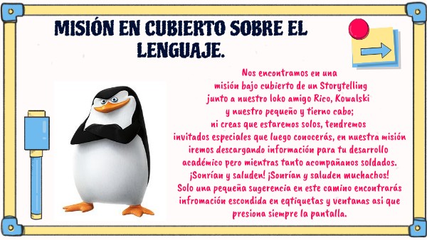 Nos encontramos en una misión bajo cubierto de un Storytellingjunto a nuestro loko amigo Rico, Kowalski y nuestro pequeño y tierno cabo; ni creas que estaremos solos, tendremos invitados especiales que luego conocerás, en nuestra misión iremos descargando información para tu desarrollo académico pero mientras tanto acompañanos soldados. ¡Sonrían y saluden! ¡Sonrían y saluden muchachos! Solo una pequeña sugerencia en este camino encontrarás infromación escondida en eqtiquetas y ventanas asi que presiona siempre la pantalla.