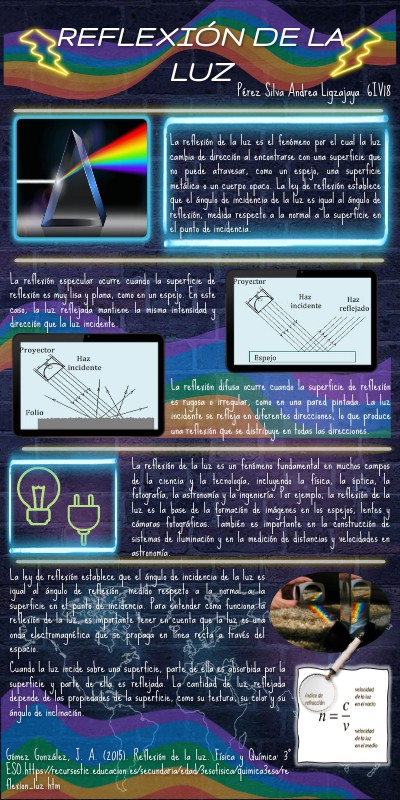 La reflexión de la luz es el fenómeno por el cual la luz cambia de dirección al encontrarse con una superficie que no puede atravesar, como un espejo, una superficie metálica o un cuerpo opaco. La ley de reflexión establece que el ángulo de incidencia de la luz es igual al ángulo de reflexión, medida respecto a la normal a la superficie en el punto de incidencia.