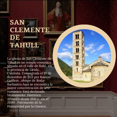 La iglesia de San Clemente de Tahull es un templo románico situado en el valle de Bohí , en la provincia de Lleida , Cataluña. Consagrada el 10 de diciembre de 1123 por Ramon Guillem , obispo de Roda-Barbastro.Aquí se encuentra la mayor concentración de arte románico. Está declarado Monumento Histórico Artístico desde 1931 y , en el 2000 , Patrimonio de la Humanidad por la Unesco.