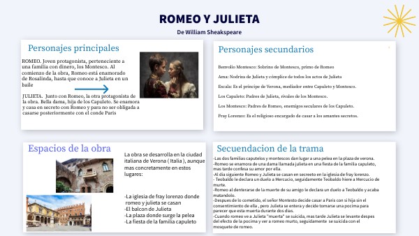 ROMEO. Joven protagonista, perteneciente a una familia con dinero, los Montesco. Al comienzo de la obra, Romeo está enamorado de Rosalinda, hasta que conoce a Julieta en un baile