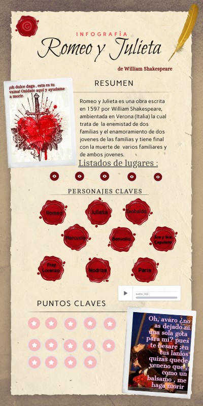 Romeo y Julieta es una obra escrita en 1597 por William Shakespeare, ambientada en Verona (Italia) la cual trata de la enemistad de dos familias y el enamoramiento de dos jovenes de las familias y tiene final con la muerte de varios familiares y de ambos jovenes.